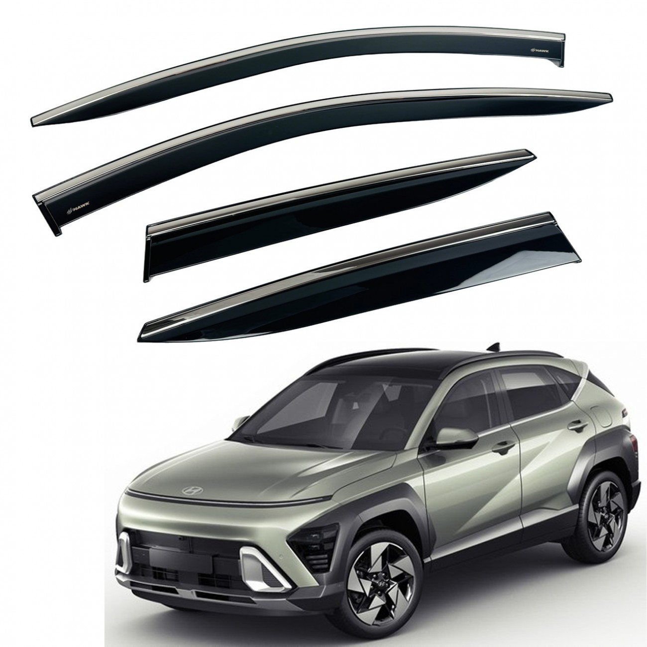 Дефлекторы окон (ветровики) для Hyundai KONA / SX2 / Kauai 2023+ нерж. с хром полоской (HAWK)